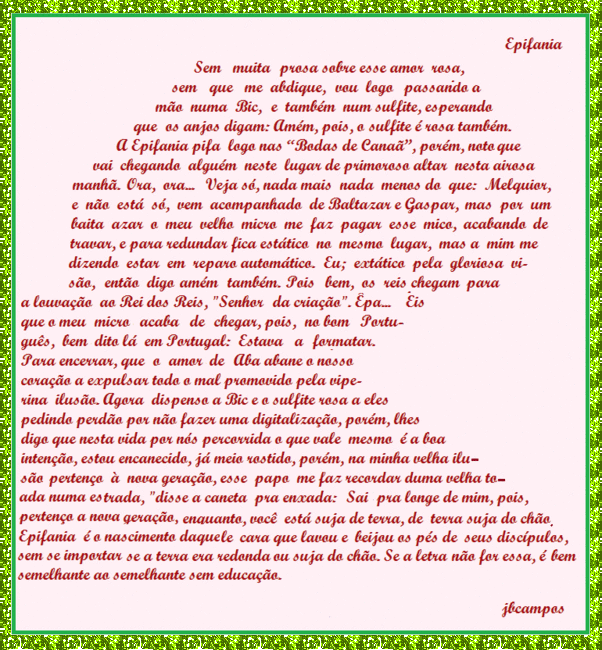 1 EPIFANIA Postado por João Batista De Campos em 21 de Abril de 2019 às 8:48pm POESIAS ARTÍSTICAS Visualizações: 116 Enviar-me um e-mail quando as pessoas deixarem os seus comentários – Seguir