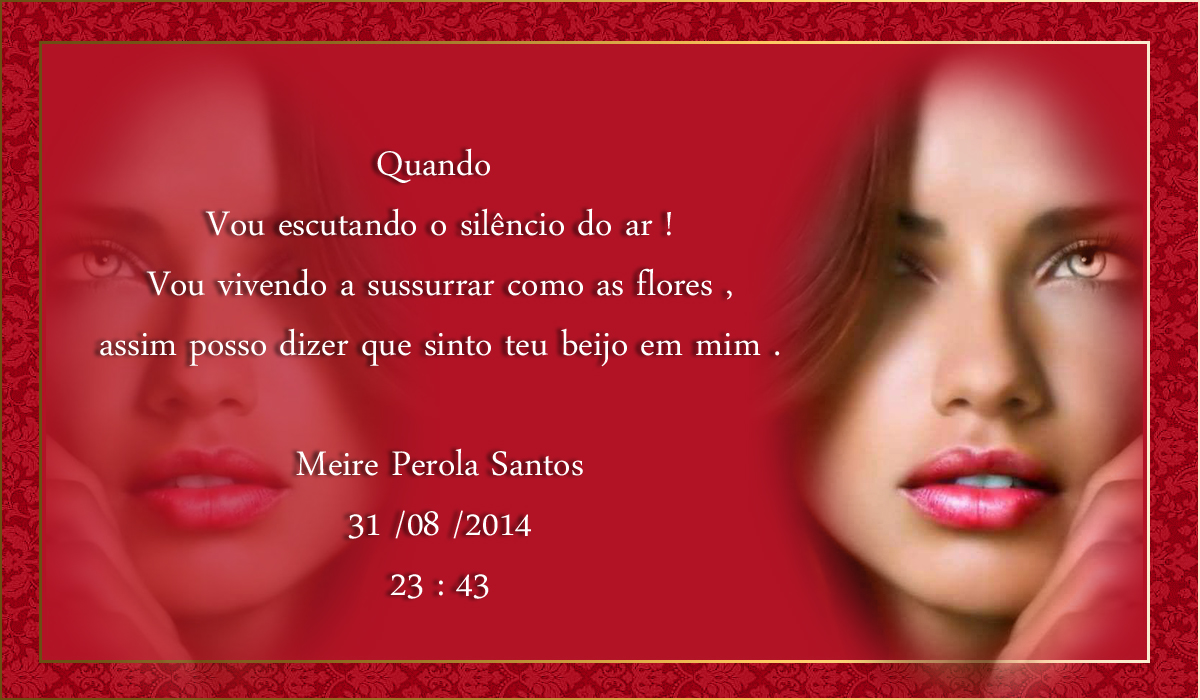 3 Quando Postado por Meire em 3 de Novembro de 2017 às 1:38am Formatado por Livita Quando Vou escutando o silêncio do ar ! Vou vivendo a sussurrar como as flores , assim posso dizer que sinto teu beijo em mim . Meire Perola Santos 31 /08 /2014 23 : 43 Visualizações: 104 Enviar-me um e-mail quando as pessoas deixarem os seus comentários – Seguir