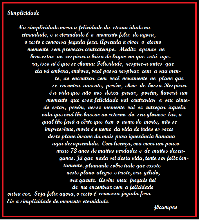 2 SIMPLICIDADE Postado por João Batista De Campos em 8 de Maio de 2019 às 12:51pm Visualizações: 238 Enviar-me um e-mail quando as pessoas deixarem os seus comentários – Seguir